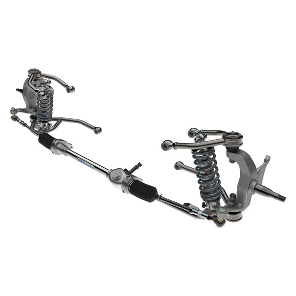 A more stripped down system with only the essentials, the Drag Race System includes billet manual rack and pinion, bump steer tie rods, and 5-inch travel coil-overs for increased extension travel.